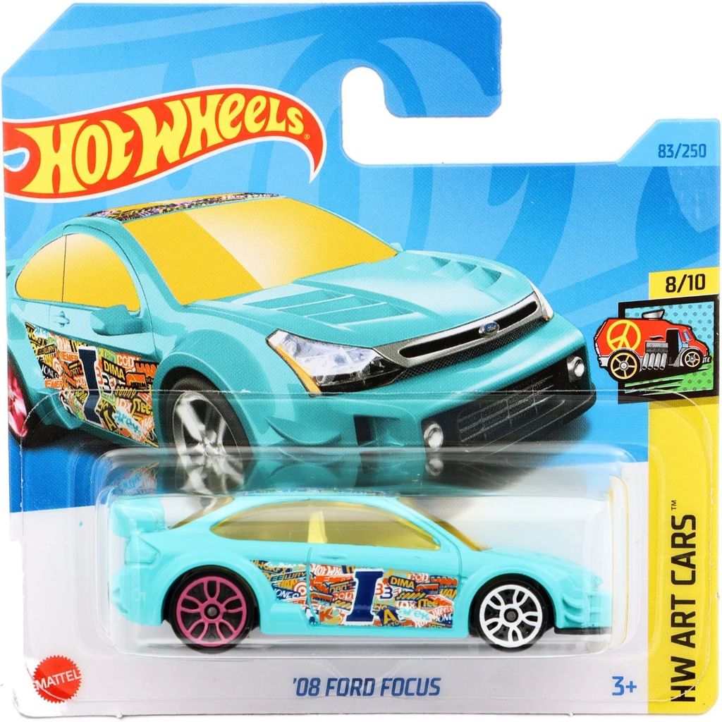 ?08 Ford Focus fra Hot Wheels og HW Art Cars-serien, hvor denne legetøjsbil er bil nummer 8/10. Bilen er inkluderet i E-case 2023 (korte kort / 5785).