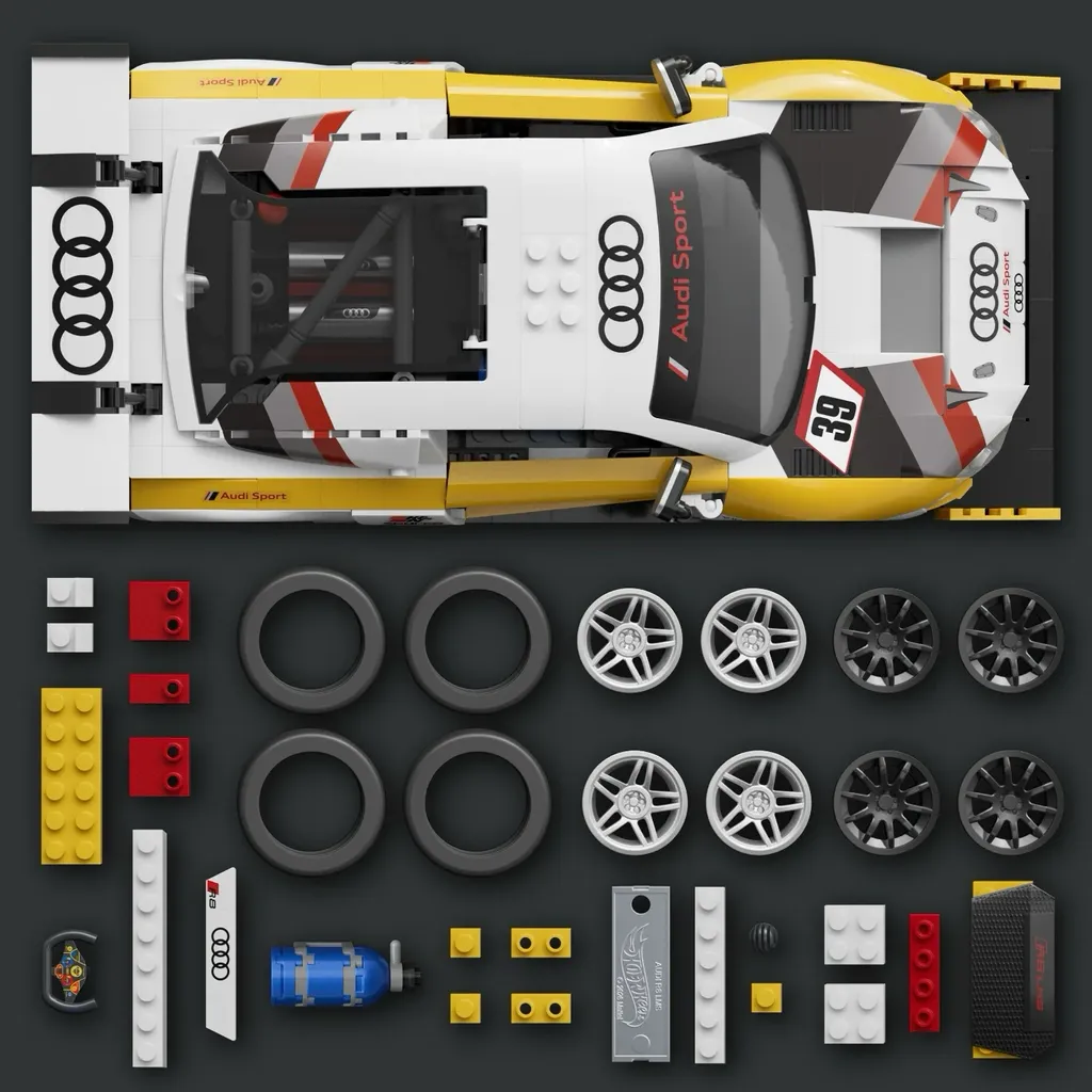 Byg en hvid og gul '15 Audi R8 LMS med dette klodssæt fra Hot Wheels Elite Series og Mattel Brick Shop.