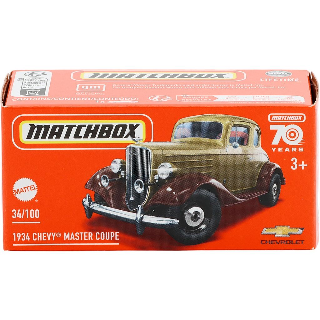 1934 Chevy Master Coupe (brun/brun) som legetøjsbil fra Matchbox og Power Grab-serien, hvor bilen leveres i en lille papkasse.