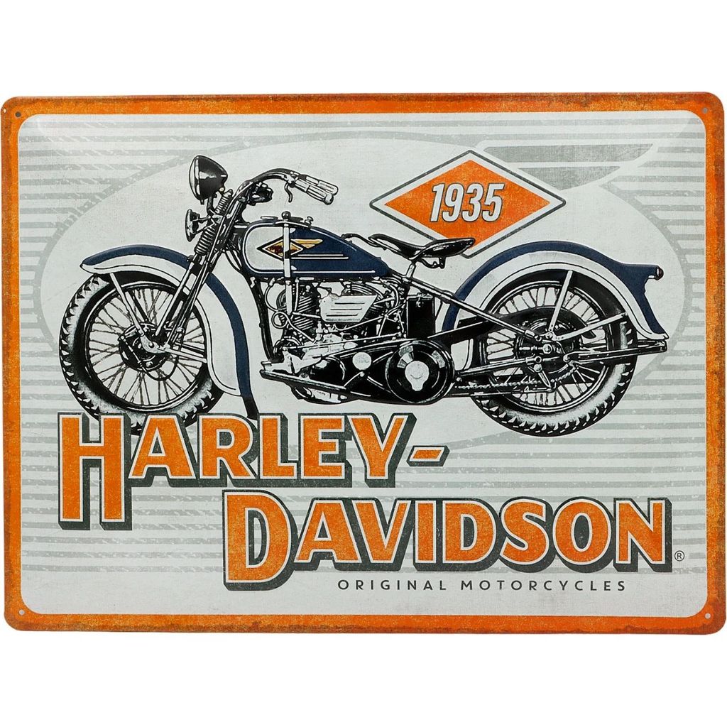 Blikskilt med et Harley-Davidson-motiv fra 1935 med teksten "1935 Harley-Davidson - Original Motorcycles".