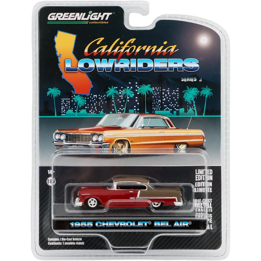 Mørkerød 1955 Chevrolet Bel Air fra Greenlight og California Lowriders Series 3-serien. Bilen anbefales fra 14 år (voksne samlere).