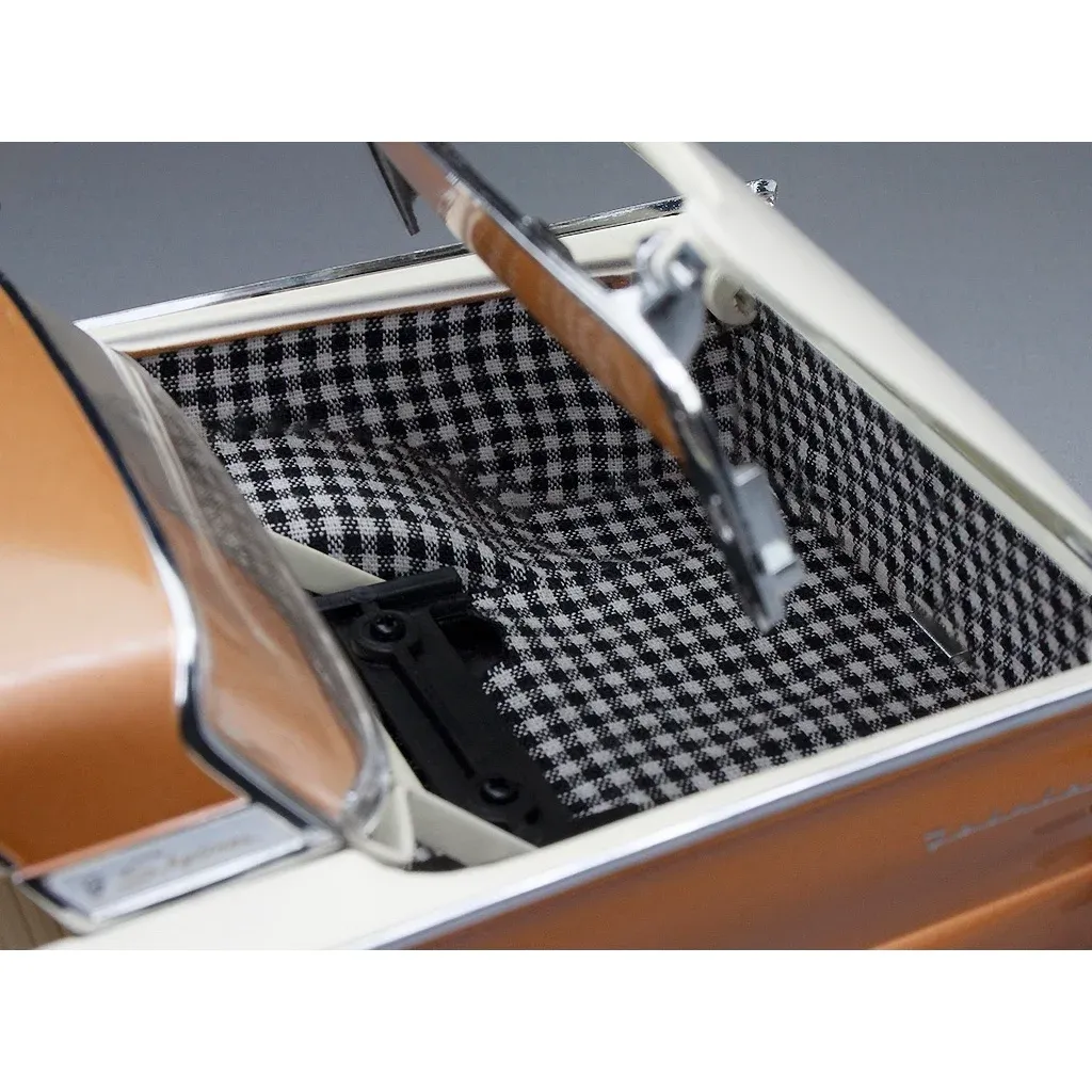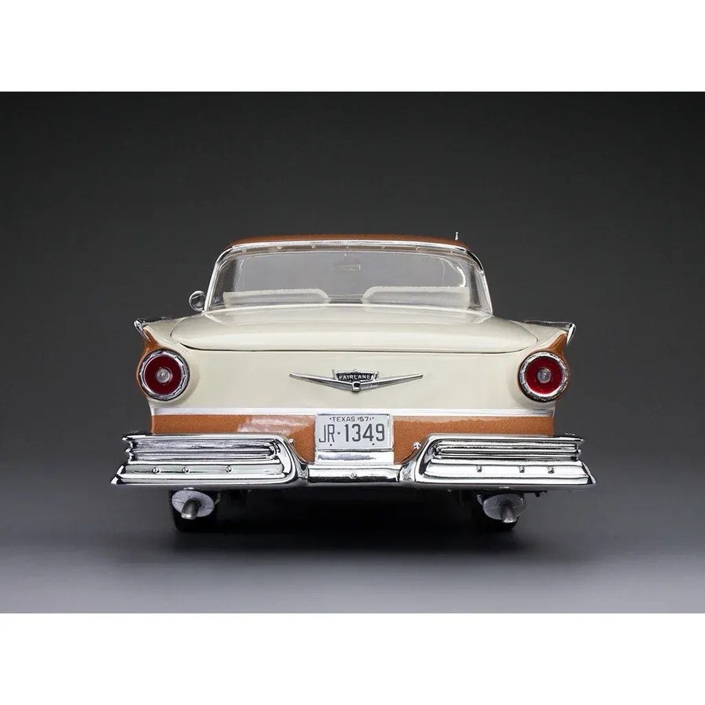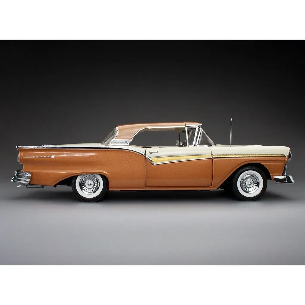 1957 Ford Fairlane 500 Skyliner modelbil i skala 1:18 (29 cm) fra Sun Star. Bilen er bronze/hvid og fremstillet af metal med plastdetaljer.