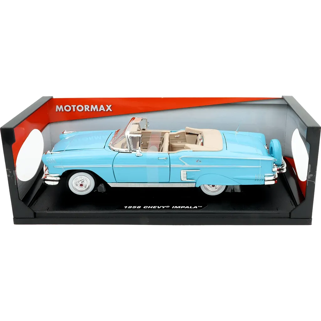 Lyseblå 1958 Chevrolet Impala med hvide dæksider fra Motormax og Timeless Legends-serien i skala 1:18 (30 cm).