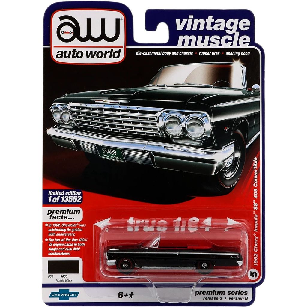 Sort 1962 Chevy Impala SS 409 Convertible med rødt interiør fra Auto World og Vintage Muscle-serien. Skalaen er 1:64 (længde 8,2 cm).