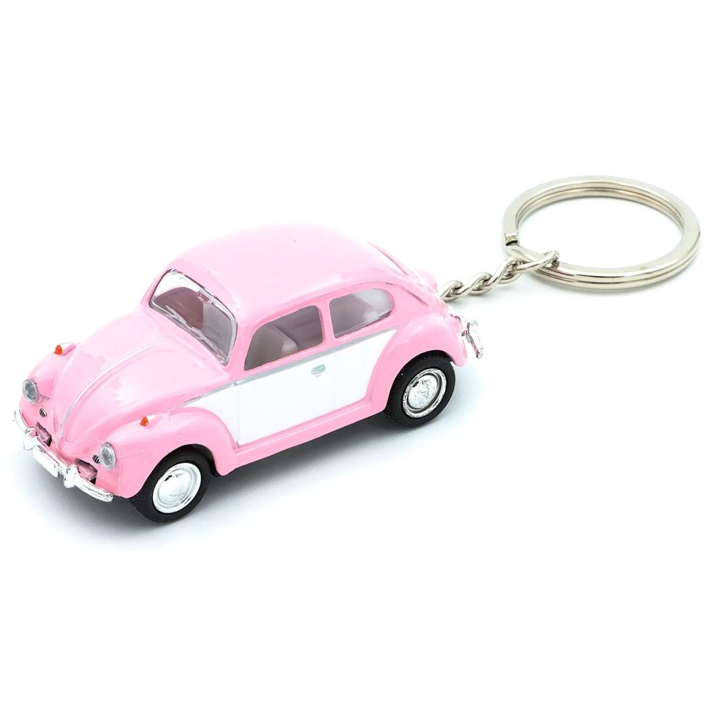 Pink 1962 Volkswagen Beetle som nøglering fra Kinsmart i skala 1:64 (længde 6,4 cm).