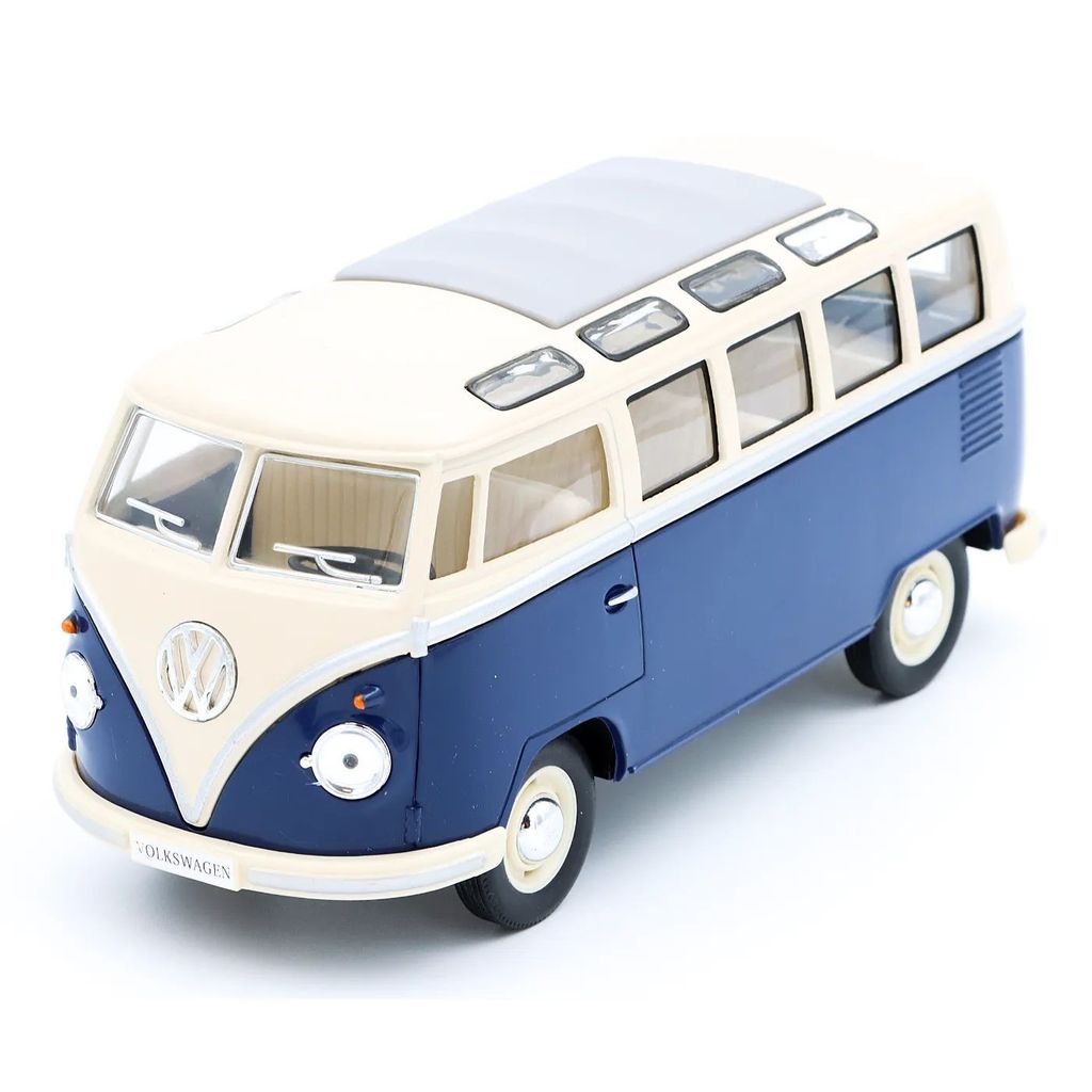 Blå og hvid 1962 Volkswagen Classical Bus fra Kinsmart i skala 1:24 (længde 17,5 cm).