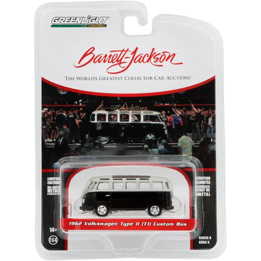 Sort Volkswagen Type II (T1) Custom Bus, modelår 1962, med gråt tag fra GreenLight og Barrett-Jackson-serien.
