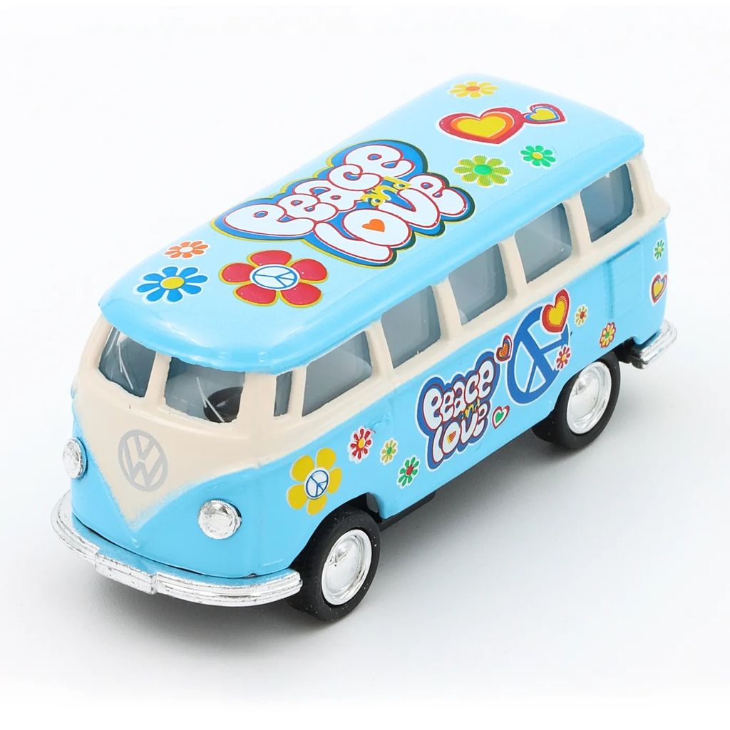 Lyseblå 1962 Volkswagen Classical Bus Flower Power fra Kinsmart i skala 1:64 (længde 6,8 cm).