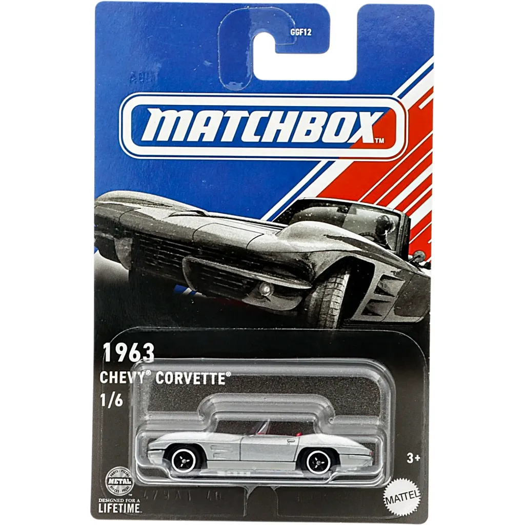 1963 Chevy Corvette i sølv fra Matchbox og serien American Convertibles, hvor denne bil er nummer 1 i serien.