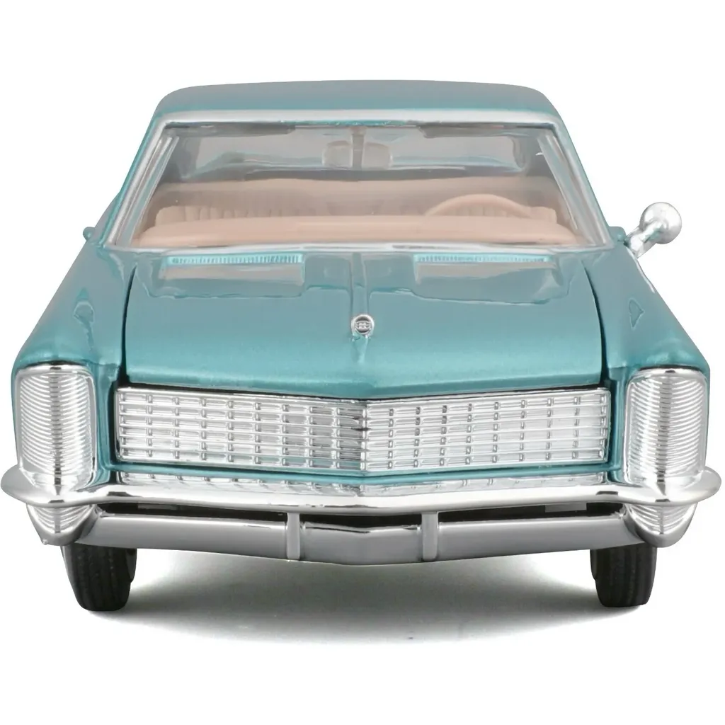 Turkis Buick Riviera, modelår 1965, som legetøjsmodel fra Maisto. Bilen er i skala 1:26 (20,5 cm) og har døre og motorhjelm, der kan åbnes.