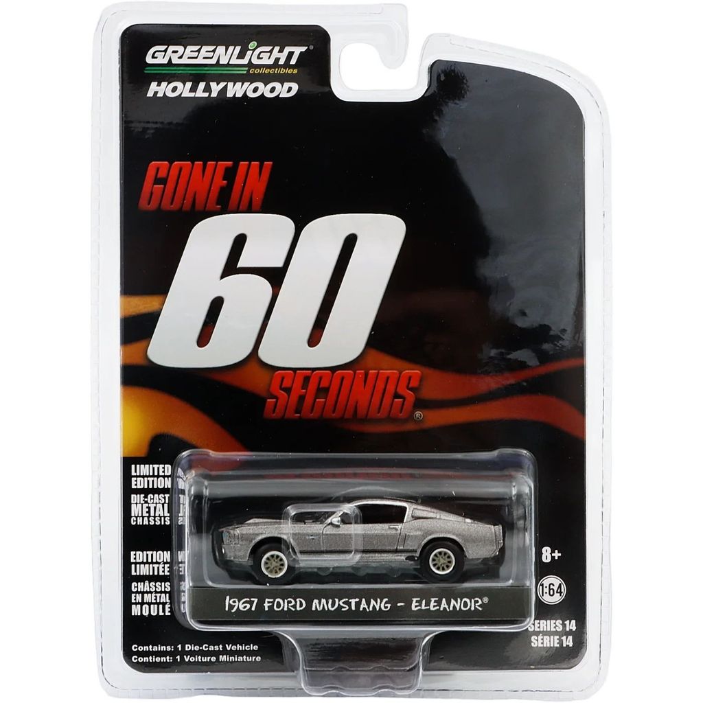 Sølvgrå 1967 Ford Mustang - Eleanor fra filmen Gone in 60 Seconds fra 2000. Bilen er lavet af amerikanske GreenLight i skala 1:64 (7,4 cm) og er en del af Hollywood-serien.