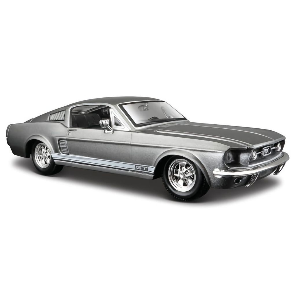 Metallisk grå (egentlig sølv) Ford Mustang GT modelår 1967. Bilen er en legetøjsmodelbil, der er velegnet til leg for større børn eller til samling og dekoration. Modellen er produceret af Maisto og er i skala 1:24 (19 cm), hvilket i dette tilfælde giver os en smuk Ford Mustang GT på ca. 19 centimeter.