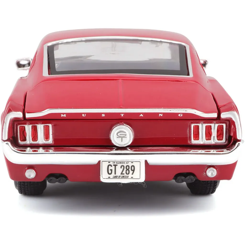Rød Ford Mustang GT, modelår 1967, som legetøjsmodel fra Maisto. Bilen er i skala 1:24 (19,4 cm) og har døre og motorhjelm, der kan åbnes.
