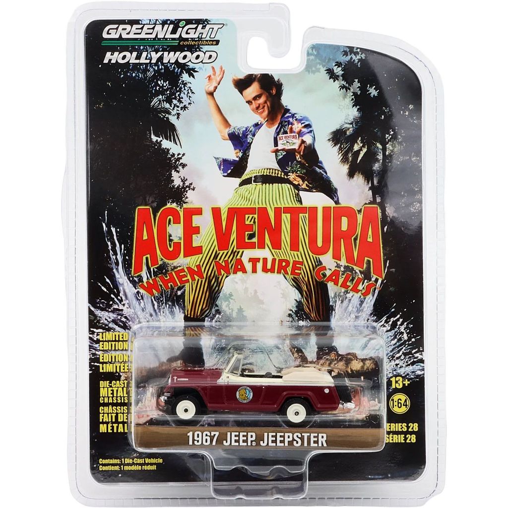 Bourgognefarvet Jeep Jeepster fra 1967 fra filmen Ace Ventura: Når naturen kalder fra 1995. Bilen er fremstillet af amerikanske GreenLight i skala 1:64 (7 cm) og er en del af Hollywood-serien.