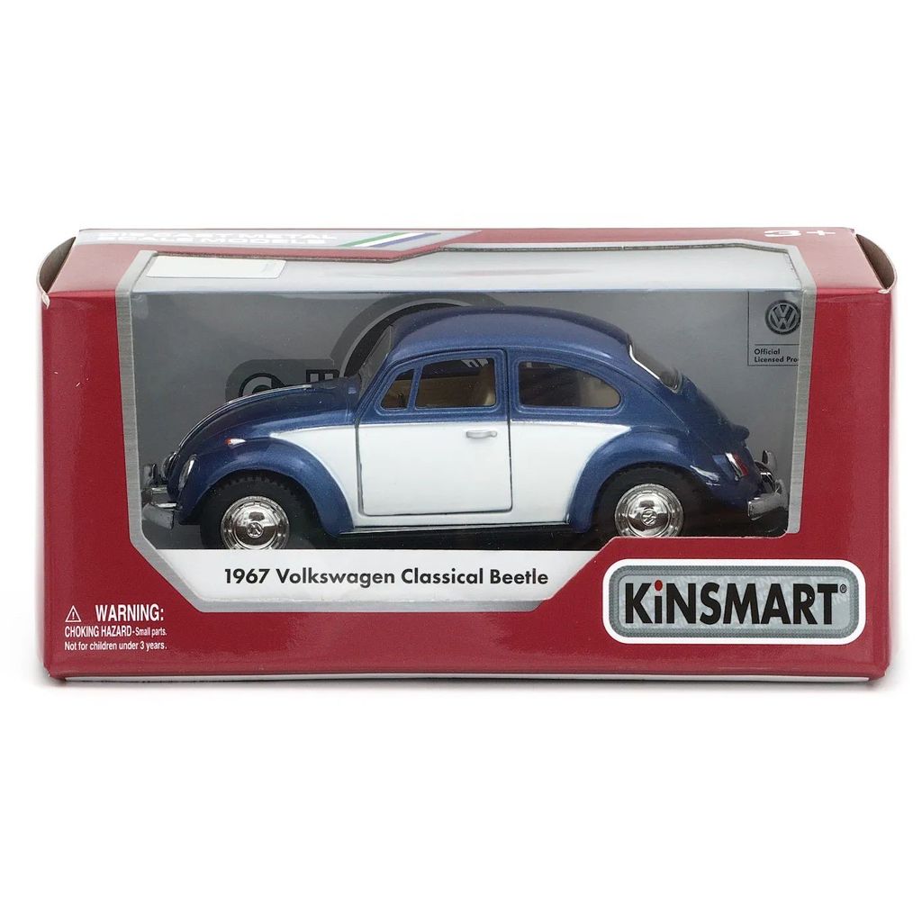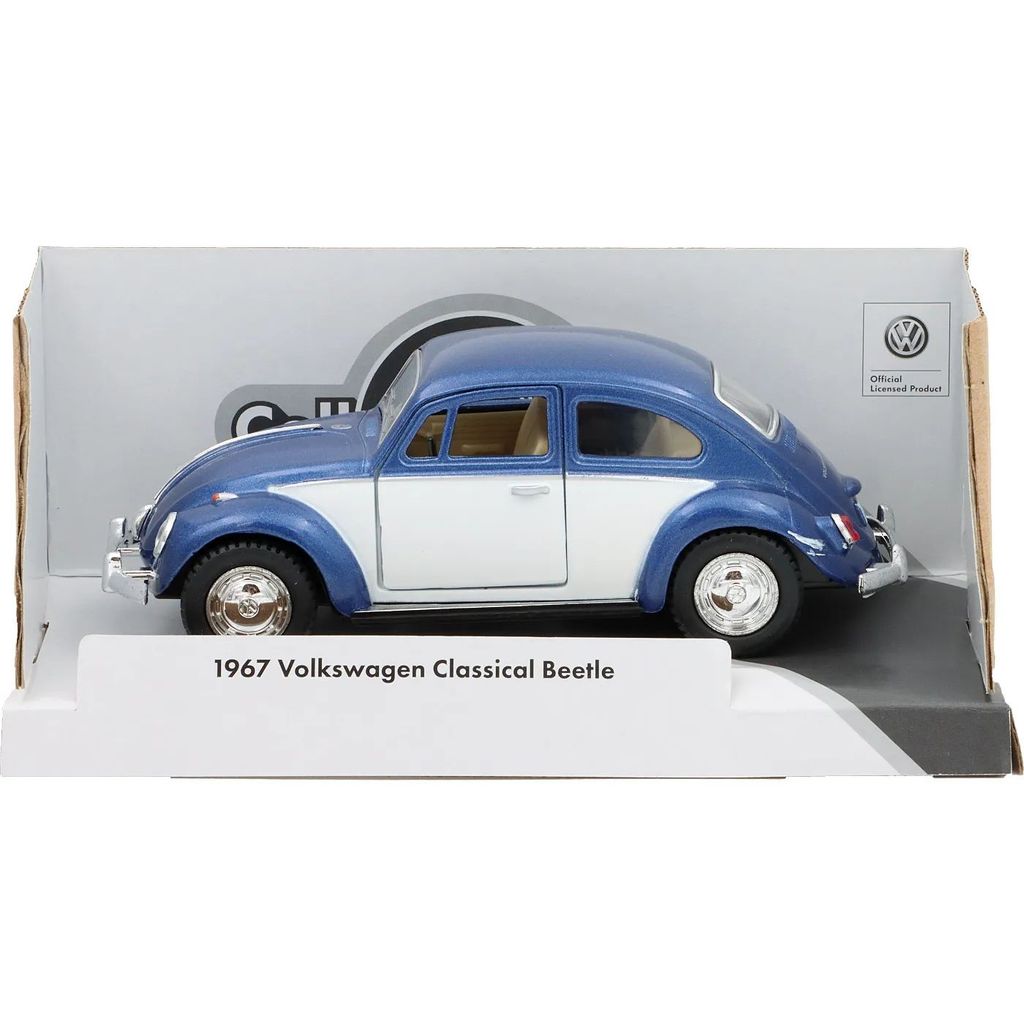 Blå og hvid 1967 Volkswagen Classical Beetle fra Kinsmart. Bilen kommer i en flot indpakning med vindue.