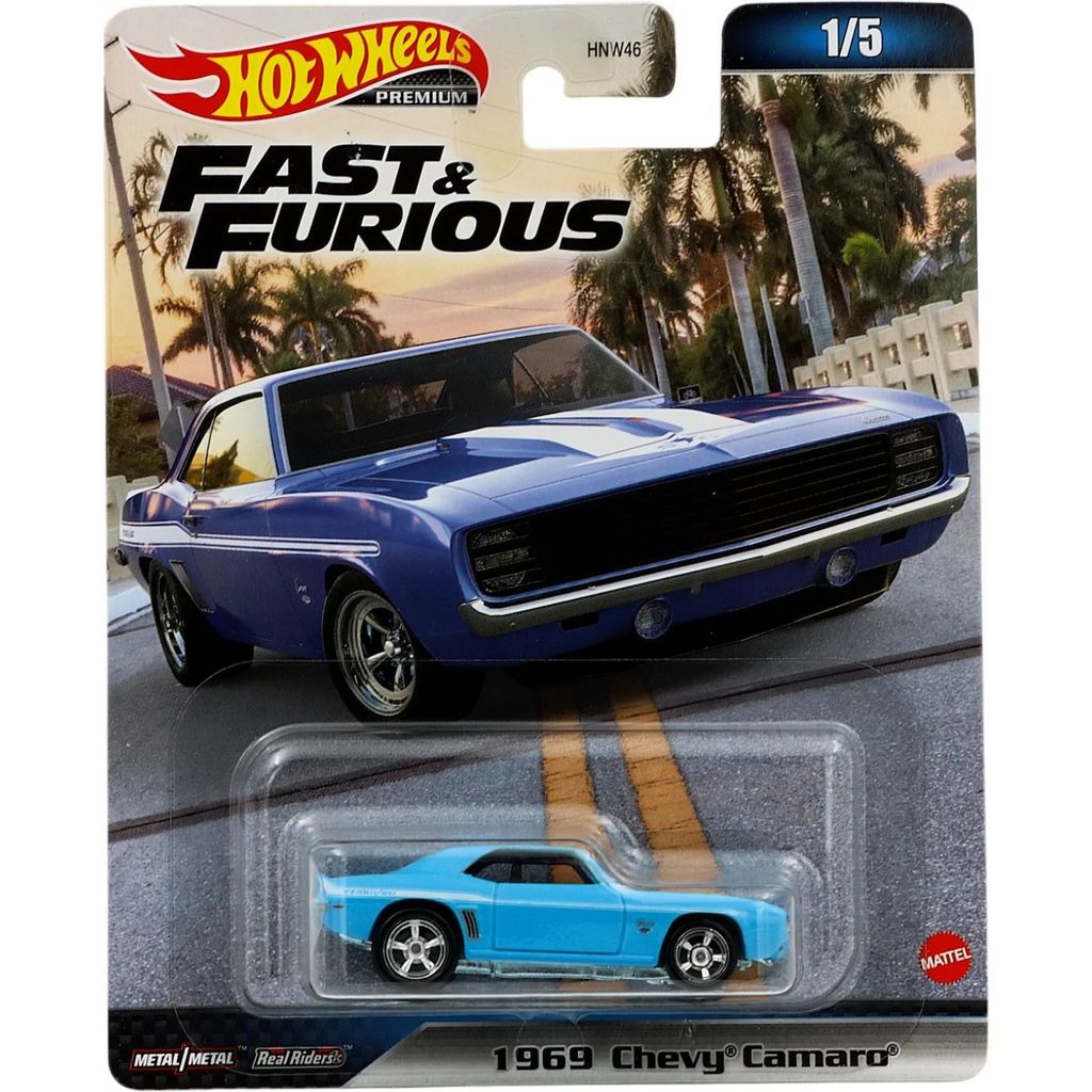 Blå 1969 Chevy Camaro fra Hot Wheels. Bilen er en del af Fast & Furious Premium Series, Mix 2-sættet fra 2023, hvor denne Chevy Camaro er bil nummer 1 ud af 5.