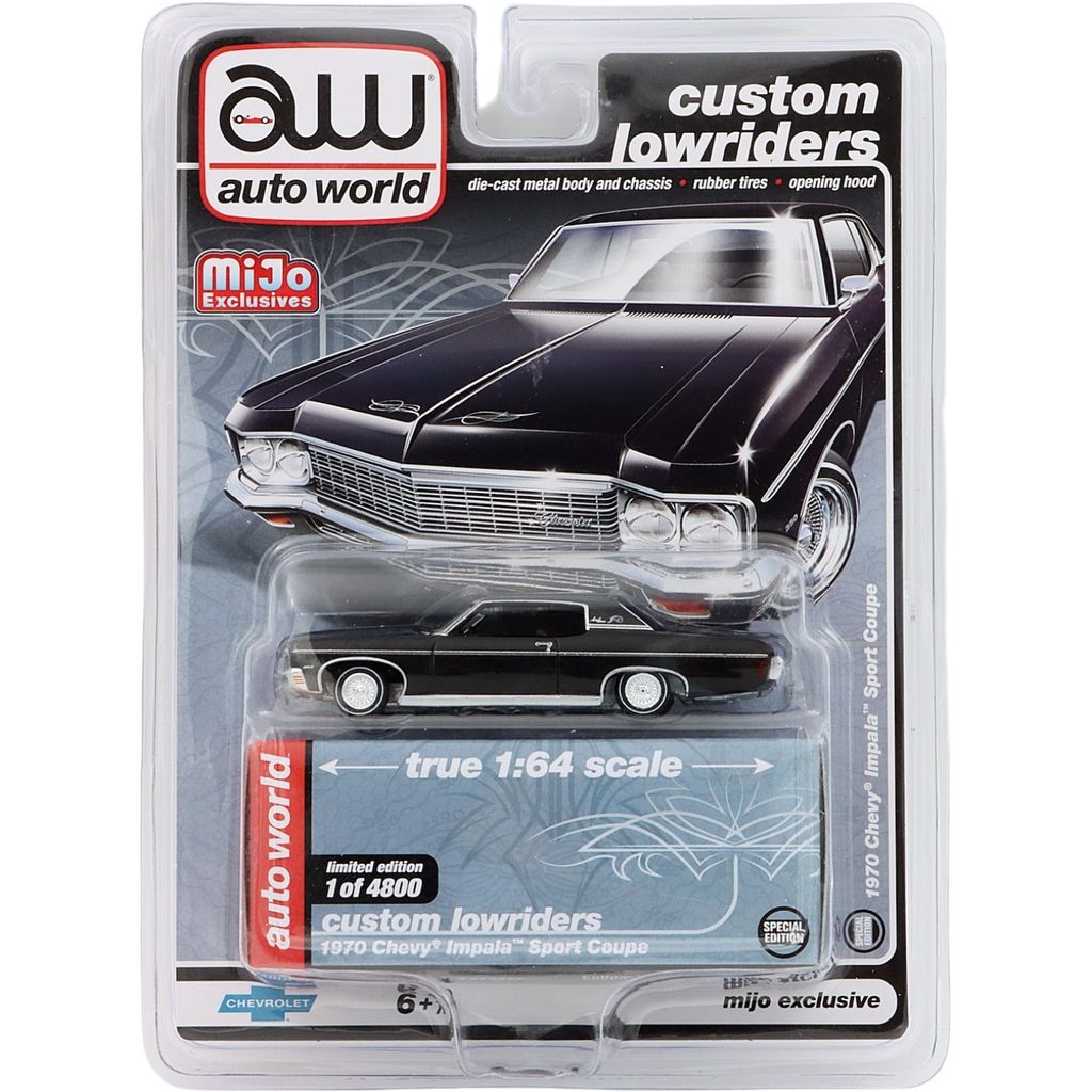 1970 Chevy Impala Sport Coupe i sort fra Auto World i skala 1:64 (8,5 cm). Bilen er en del af Auto Worlds Custom Lowriders-serie.