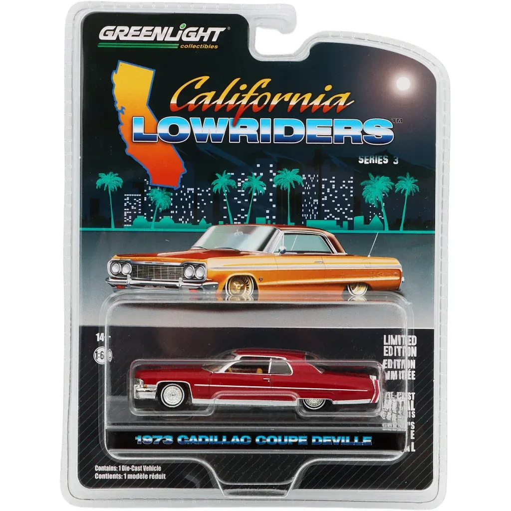 Mørkerød Cadillac Coupe DeVille fra 1973 fra Greenlight og California Lowriders Series 3-serien. Bilen anbefales fra 14 år (voksne samlere).