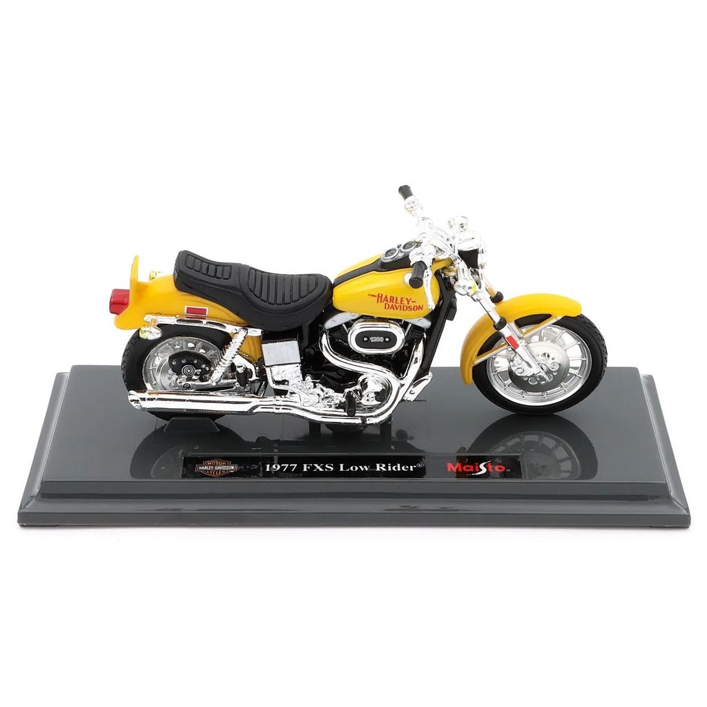 Motorcyklen er monteret på en bundplade med motorcyklens navn "1977 FXS Low Rider" og Harley-Davidson- og Maisto-logoerne. Pladen får motorcyklen til at skille sig ud på hylden.