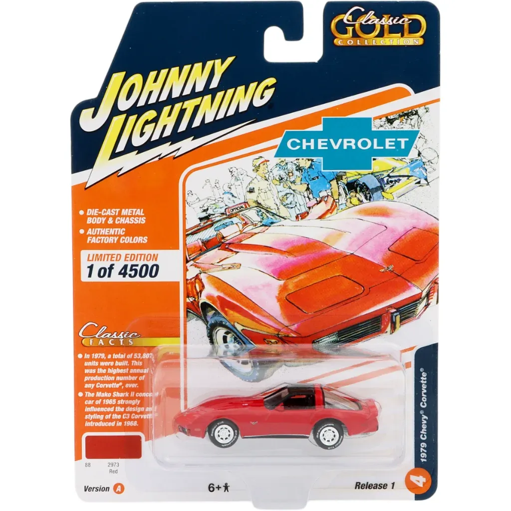 Rød Chevy Corvette (C3), modelår 1979, fra Johnny Lightning og Classic Gold Collection-serien. Bilen er i skala 1:64 (7,5 cm).