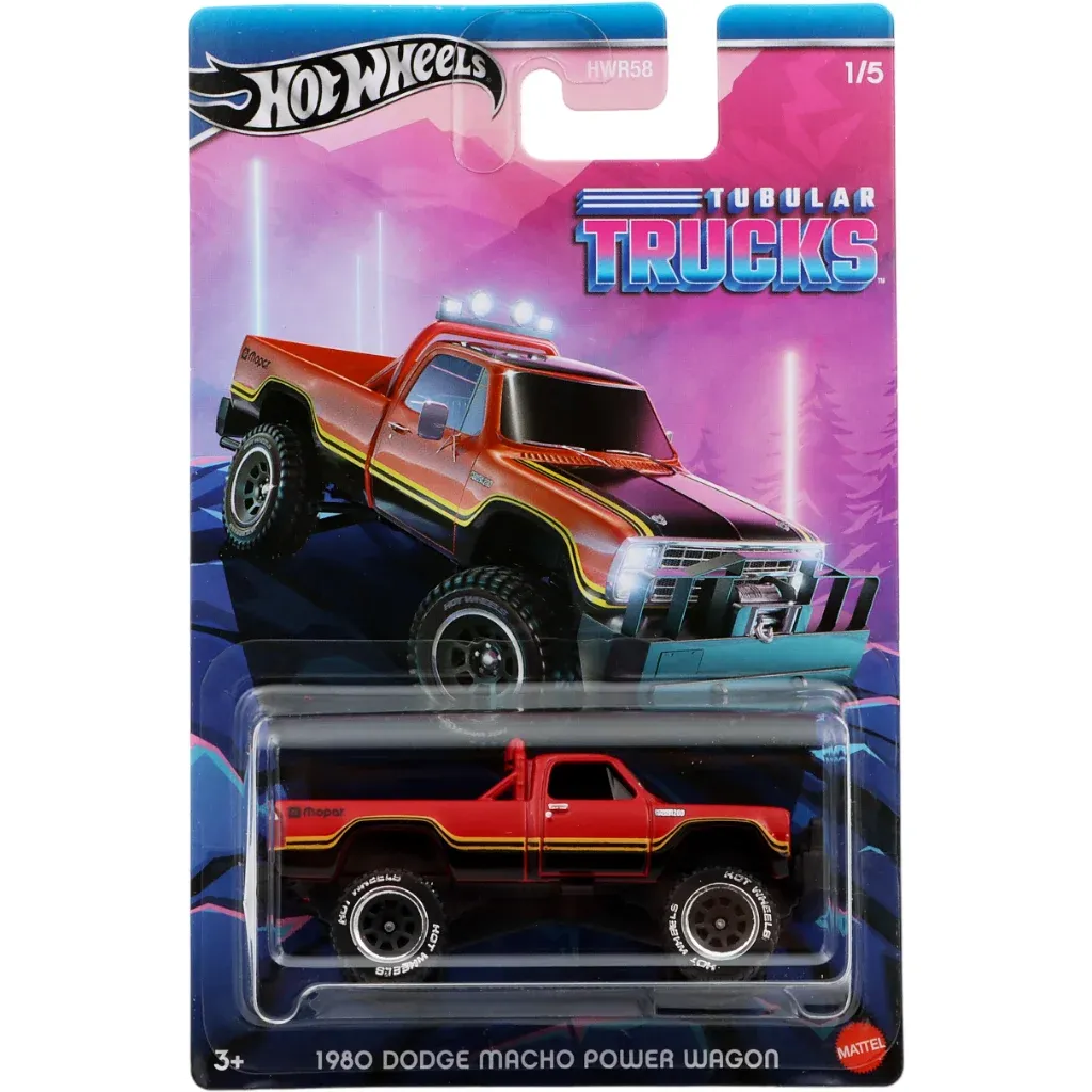 Rød og sort 1980 Dodge Macho Power Wagon fra Hot Wheels og Tubular Trucks-serien fra 2024, hvor denne Dodge-pickup er bil nummer 1 af 5.