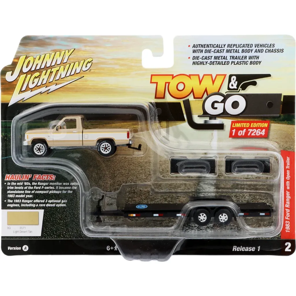 1983 Ford Ranger med åben trailer fra Johnny Lightning og Tow & Go-serien. Bilen er i skala 1:64 (7,1 cm), med anhænger måler køretøjet 20 cm.