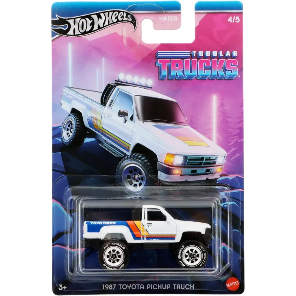 Hvid 1987 Toyota Pickup Truck (Hilux) fra Hot Wheels og Tubular Trucks serien fra 2024, hvor denne Toyota pickup er bil nummer 4 ud af 5.