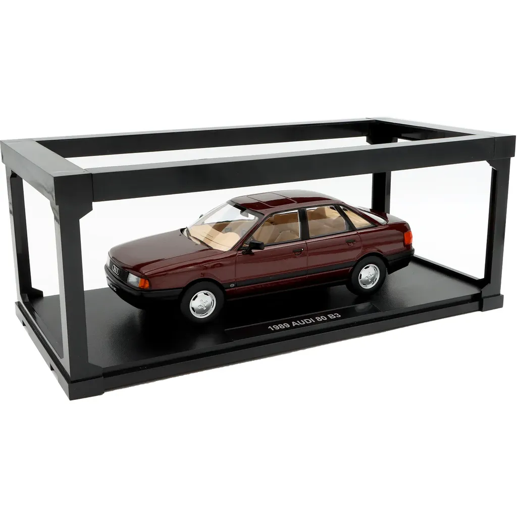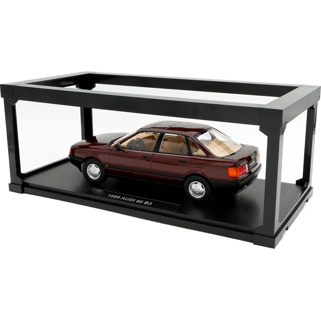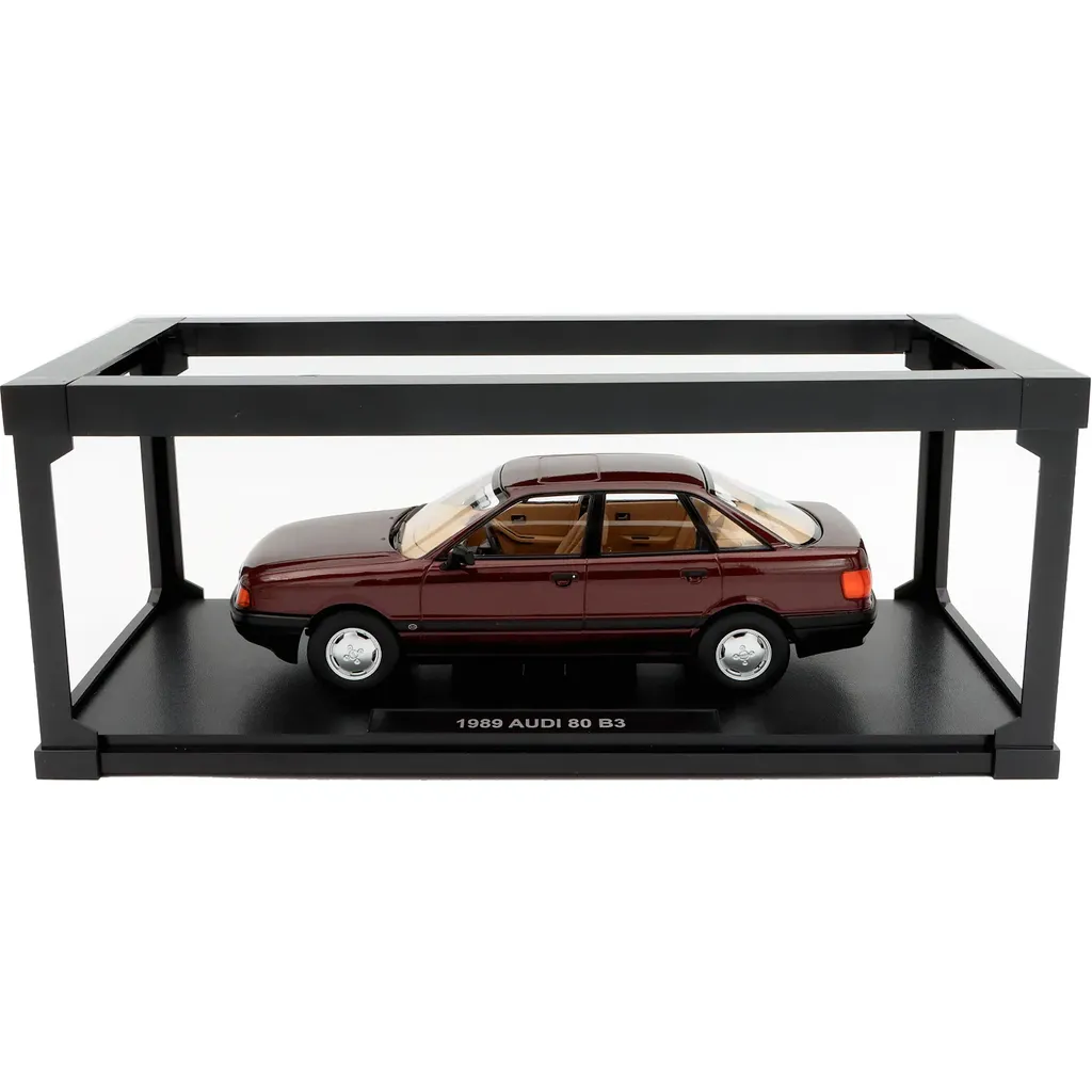Modellen står på en sort bundplade med en ramme med teksten "1989 Audi 80 B3" i sølv/grå. Rammen kan nemt tages af, så bilen kan stå pænt hjemme på hylden eller i vitrineskabet.