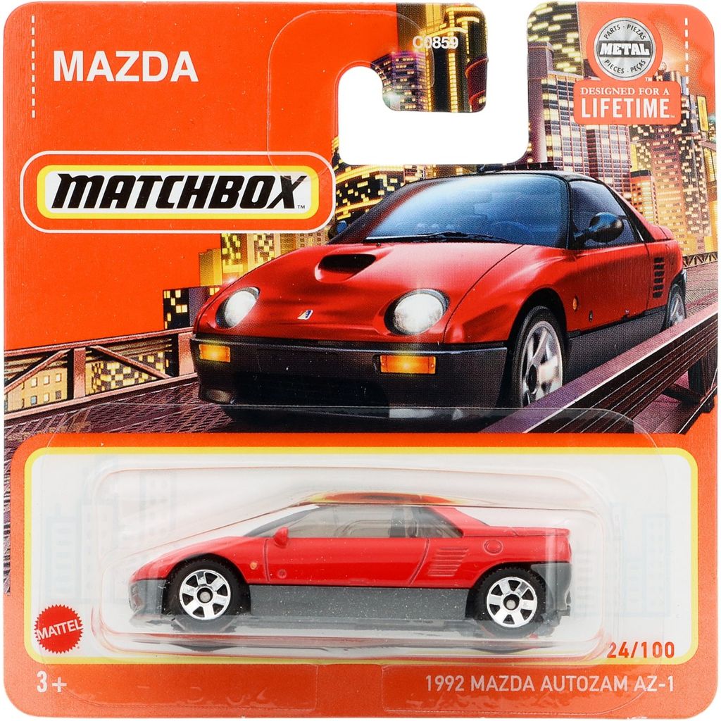 Rød Mazda Autozam AZ-1 fra 1992, hvor denne bil er bil nummer 24/100 i Matchbox-serien.