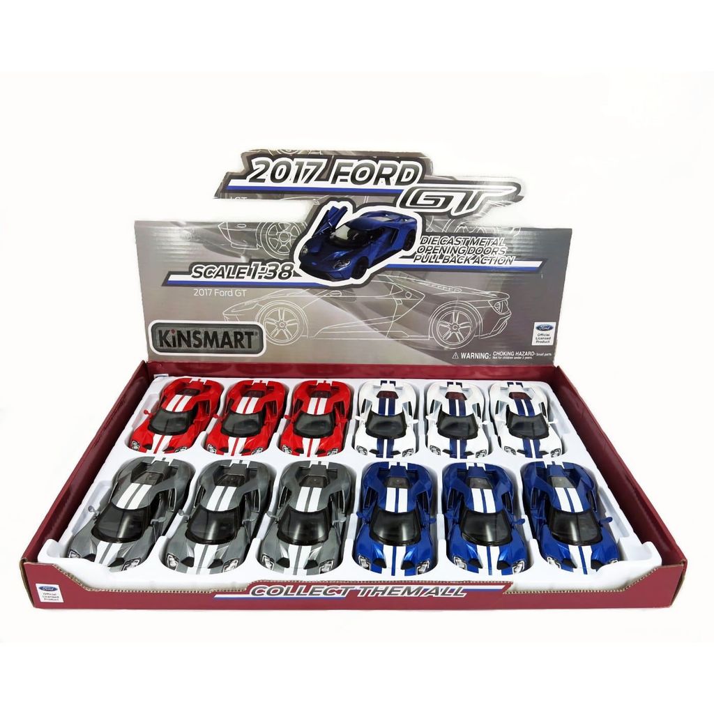2017 Ford GT fra Kinsmart til leg eller samling. Skalaen er 1:38, og Ford'en fås i flere farver. Døre, der kan åbnes og trækkes tilbage.