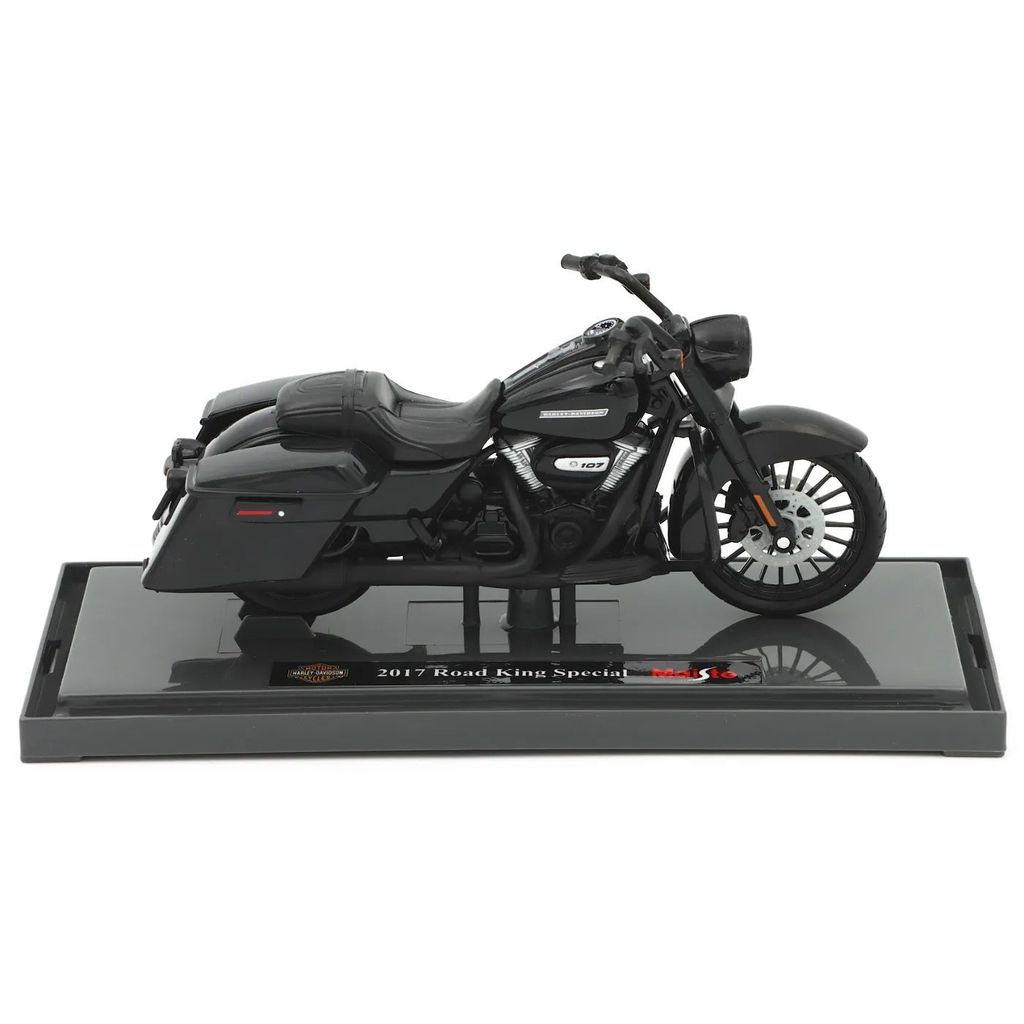 Motorcyklen er monteret på en bundplade med motorcyklens navn "2017 Road King Special" og Harley-Davidson- og Maisto-logoerne. Pladen får motorcyklen til at skille sig ud på hylden.
