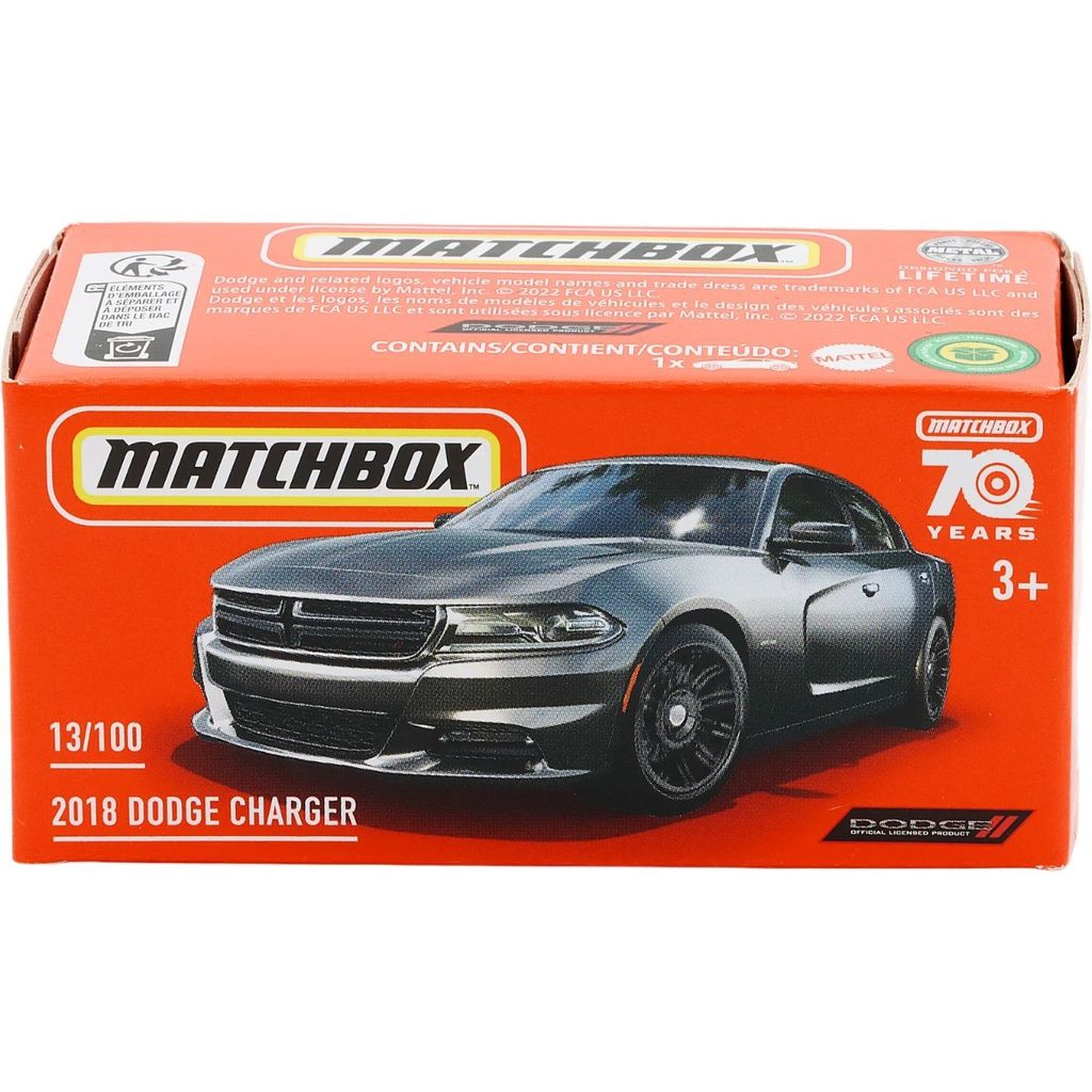 2018 Dodge Charger fra Matchbox og Power Grab-serien, hvor denne legetøjsbil er bil nummer 13/100.
