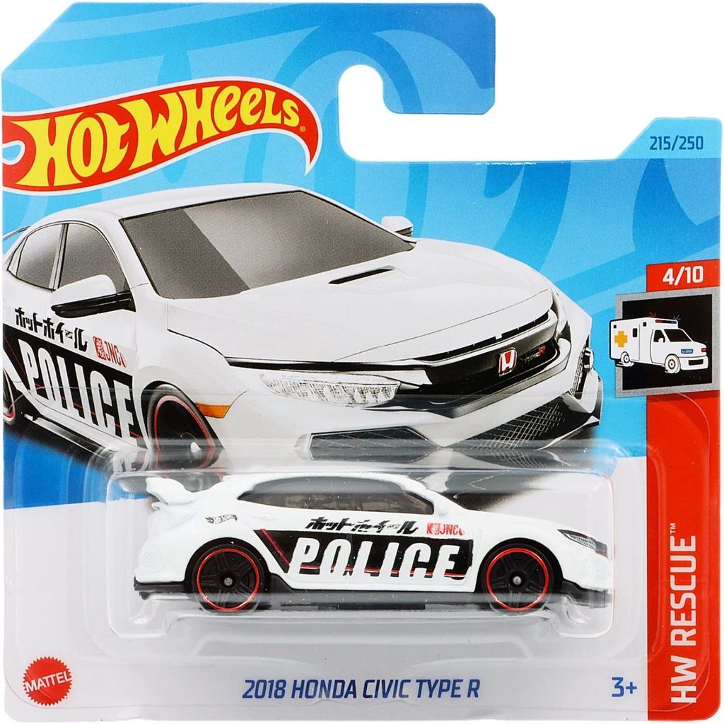 2018 Honda Civic Type R fra Hot Wheels og HW Rescue-serien, hvor denne legetøjsbil er bil nummer 4/10. Bilen er nummer 215/250 fra 2023 og har et kort kort (5785). Bilens artikelnummer er HKJ21. Netop denne bil indgår blandt andet i M-kasse 2023.