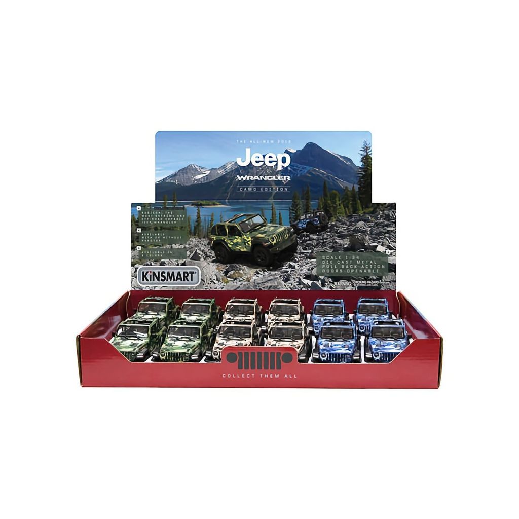 Bilen er i skala 1:34, hvilket betyder en længde på 12,5 cm. Det officielle navn på produktet fra Kinsmart er "2018 Jeep Wrangler Camo (Open Top)".