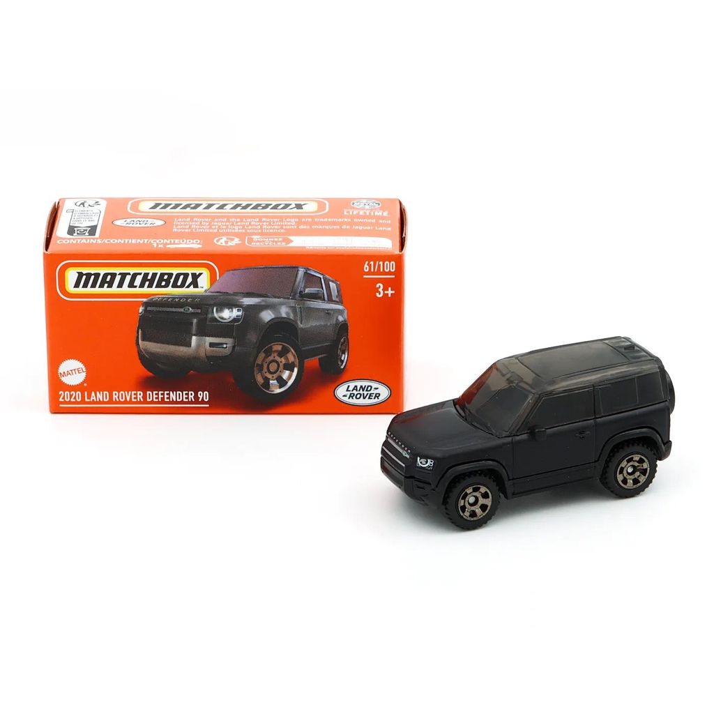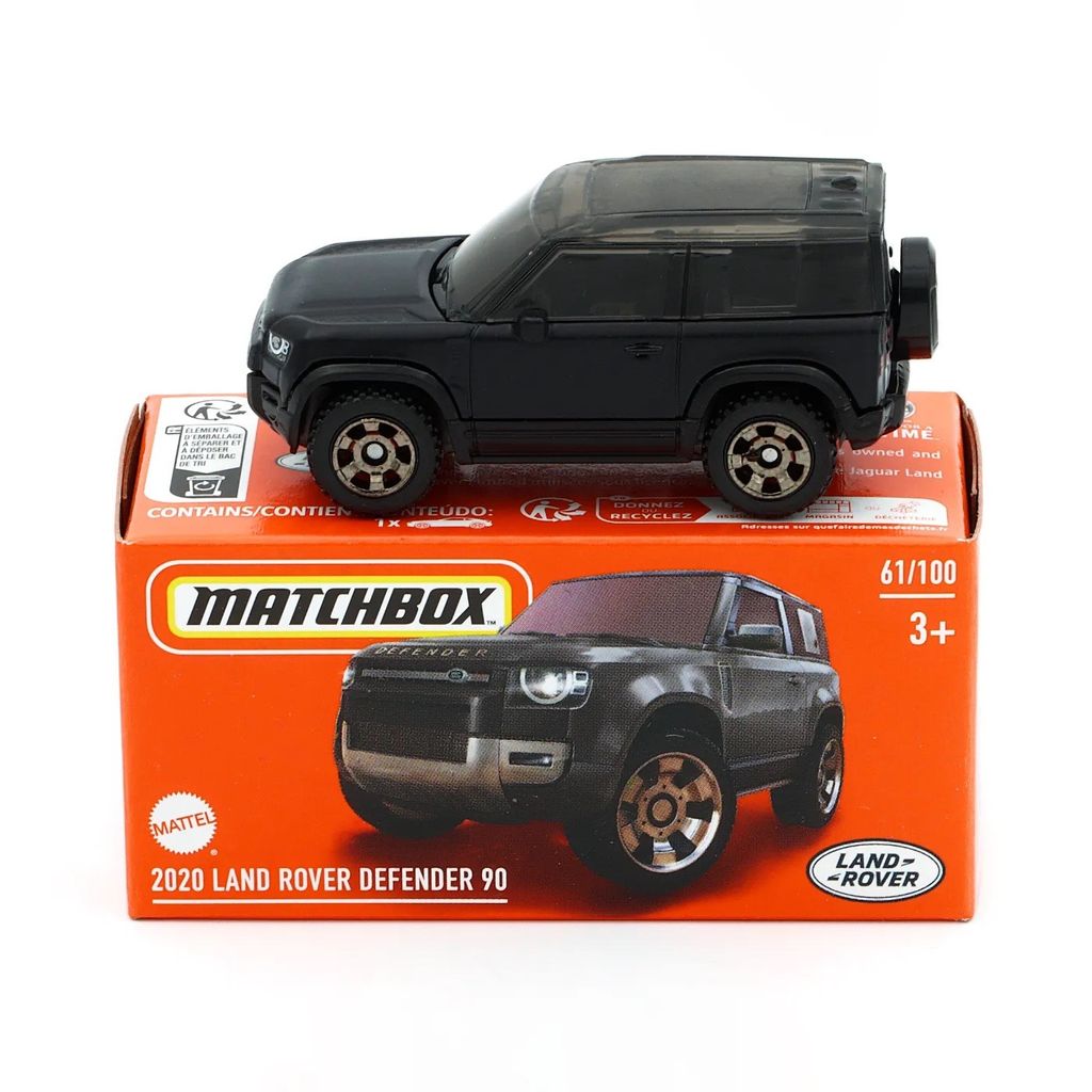 Sort 2020 Land Rover Defender 90 fra Matchbox og Power Grab-serien, hvor denne legetøjsbil er bil nummer 61/100.