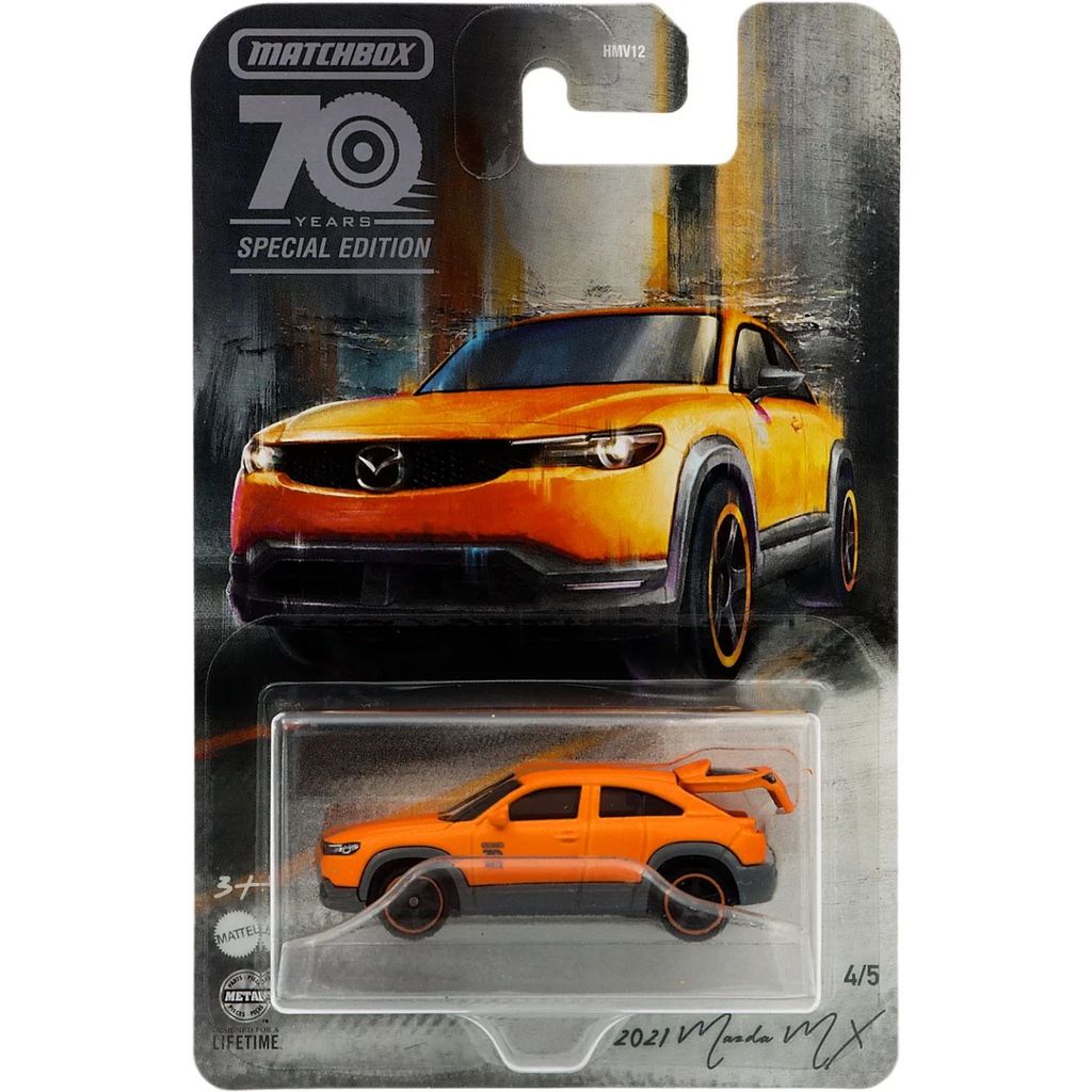 Orange 2021 Mazda MX fra Matchbox og deres serier 70 Years Special Edition og Moving Parts, hvor sidstnævnte betyder, at legetøjsbilen har åbningsdetaljer. I dette tilfælde er det Mazdas bagklap, der kan åbnes. Bilen er nummereret 4/5 i denne serie som vist på kortet.