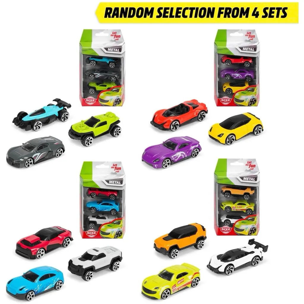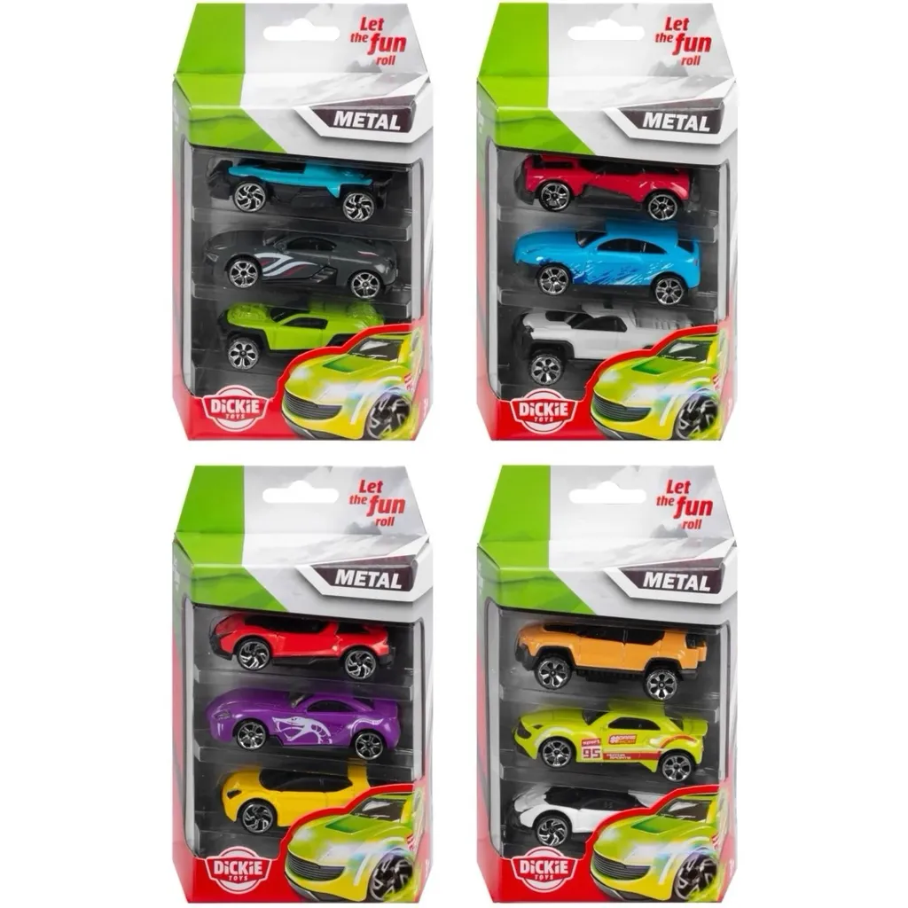 3-pak med legetøjsbiler fra Dickie Toys. Bilerne er ca. 6,5 cm lange og lavet af metal med plastdetaljer.
