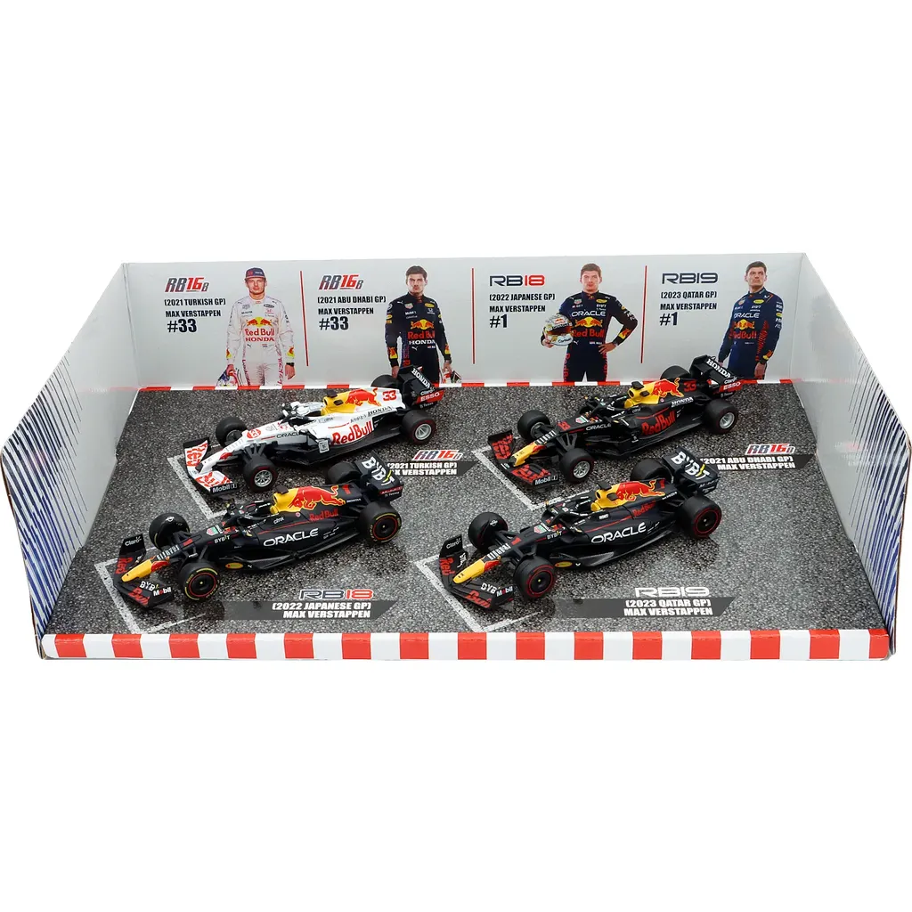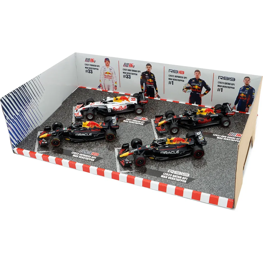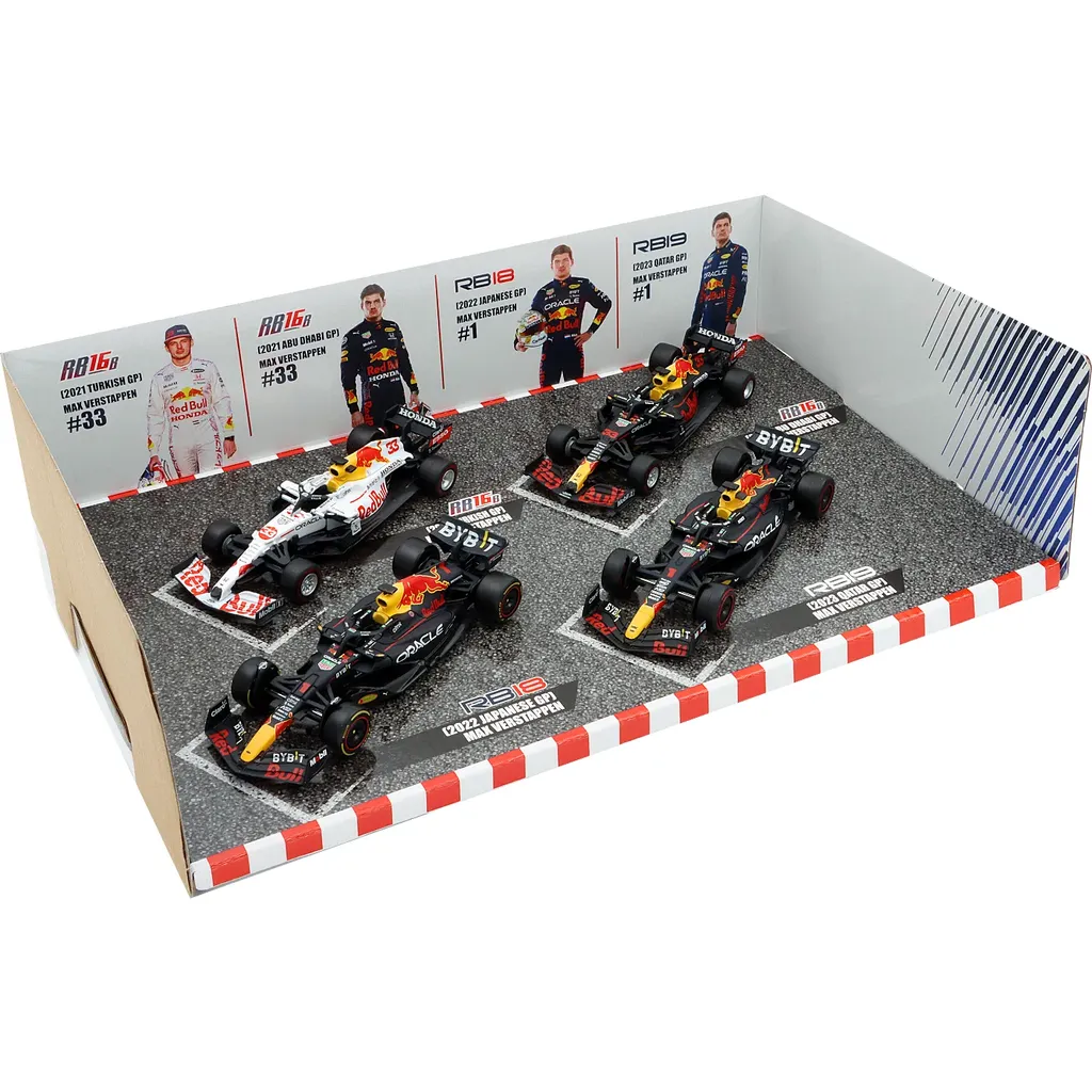 Sæt med fire F1-biler kørt af Max Verstappen, da han blev verdensmester i 2021, 2022 og 2023. Sættet er fra Bburago, og bilernes målestok er 1:43 (ca. 13 cm lange biler).