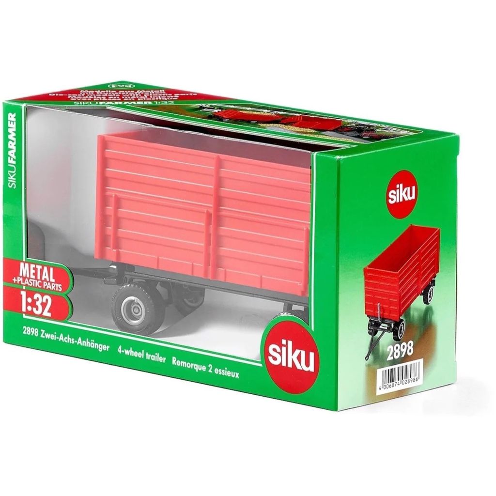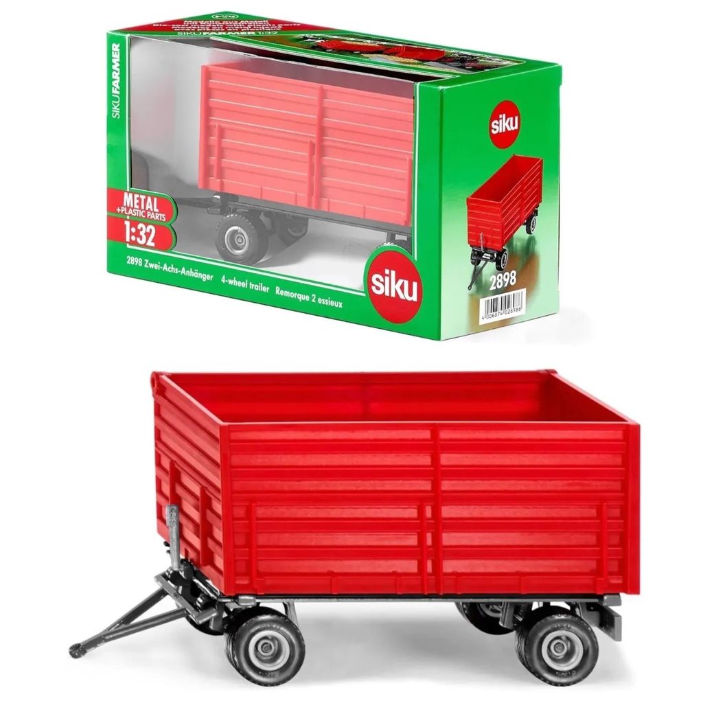 Rød trailer, der passer til traktorer fra Siku i skala 1:32. Produktet hedder 4-hjulstrailer og har produktnummer 2898.