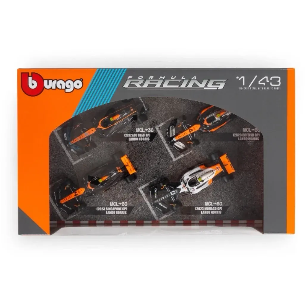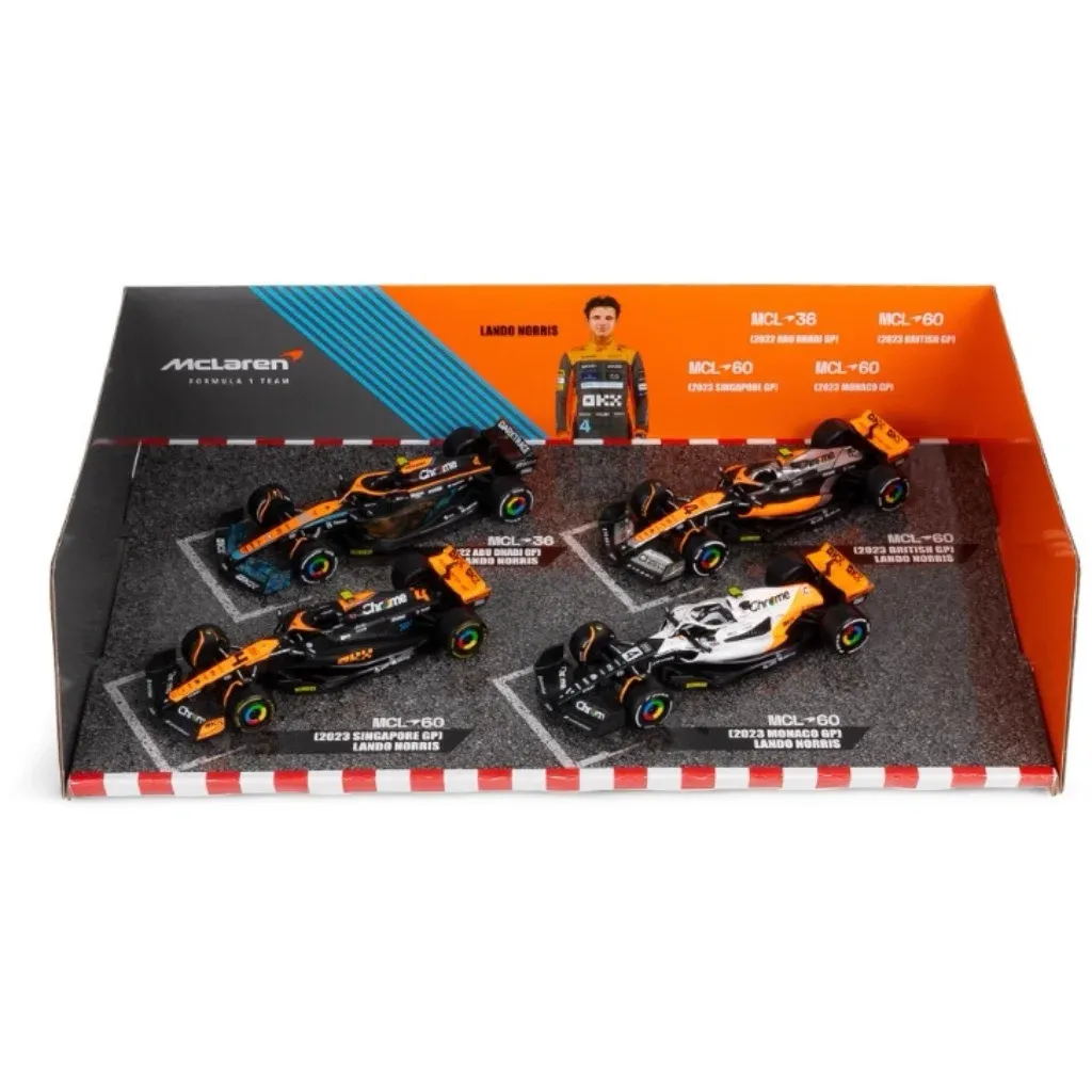 Sæt med fire F1-biler kørt af Lando Norris i 2022 (MCL36) og 2023 (MCL60). Sættet er fra Bburago, og bilernes målestok er 1:43 (ca. 13 cm lange biler).