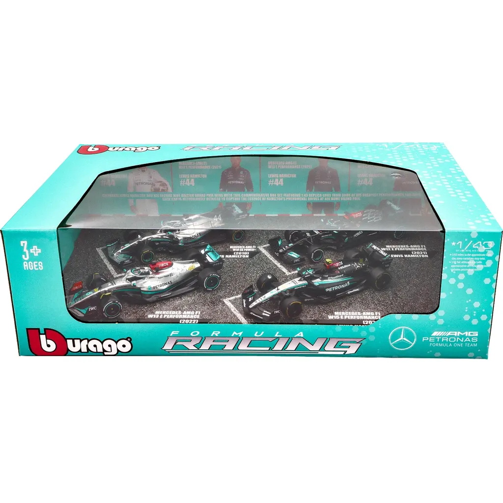 Sæt med fire F1-biler kørt af Lewis Hamilton i 2019 (W10), 2021 (W12), 2022 (W13) og 2024 (W15). Sættet er fra Bburago, og bilernes skala er 1:43 (ca. 13 cm lange biler).