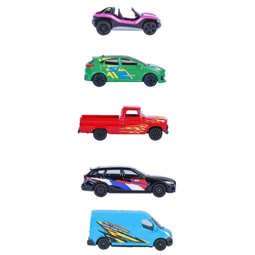5-pak Majorette-legetøjsbiler fra serien Street Cars. Køretøjerne er lavet af metal med plastdetaljer og er 6-7 cm lange.