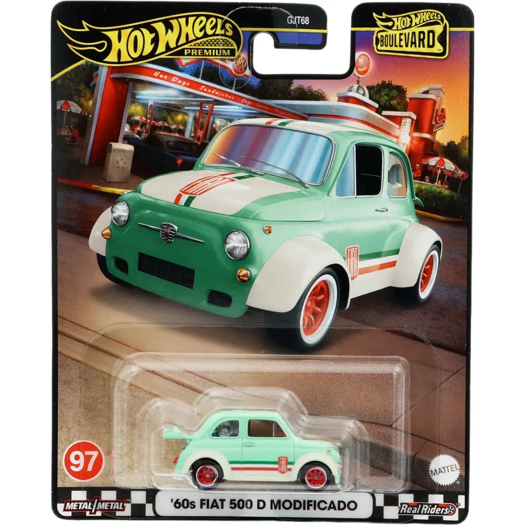 60 Fiat 500 D Modificado fra Hot Wheels Premium og Boulevard Mix 2-serien fra 2024, hvor denne Fiat er bil nummer 97 i Boulevard-serien.