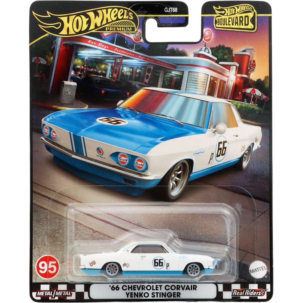 Hvid og blå '66 Chevrolet Corvair Yenko Stinger fra Hot Wheels og Boulevard-sættet, hvor denne bil er nummer 95, udgivet i 2024 i Mix 1.