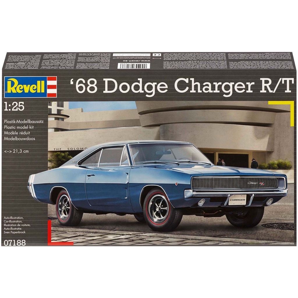 Byggemodel i plast fra Revell, der udfordrer dig til at bygge en Dodge Charger R/T fra '68 i skala 1:25 (21,3 cm).