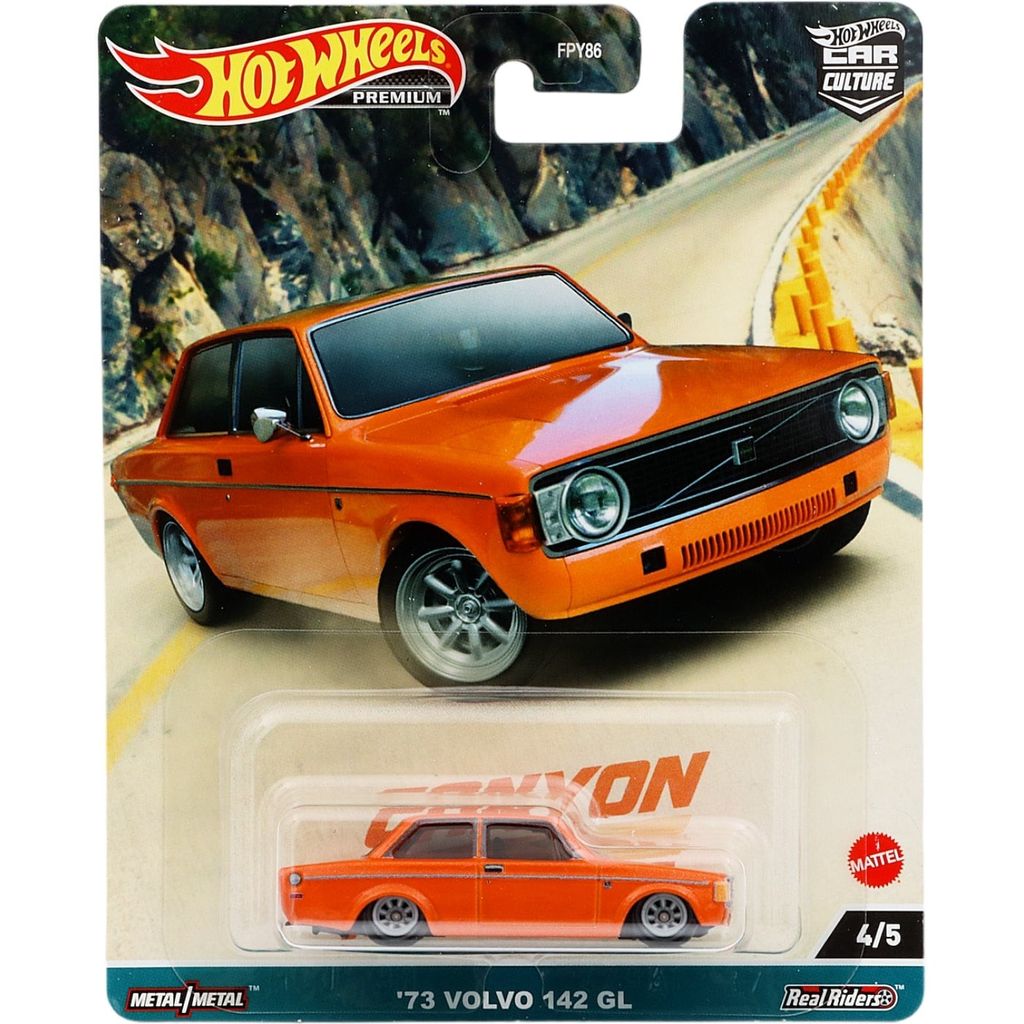 Orange '73 Volvo 142 GL fra Hot Wheels and the Car Culture: Canyon Warriors-sættet fra 2023, hvor denne klassiske Volvo er bil nummer 4 ud af 5.