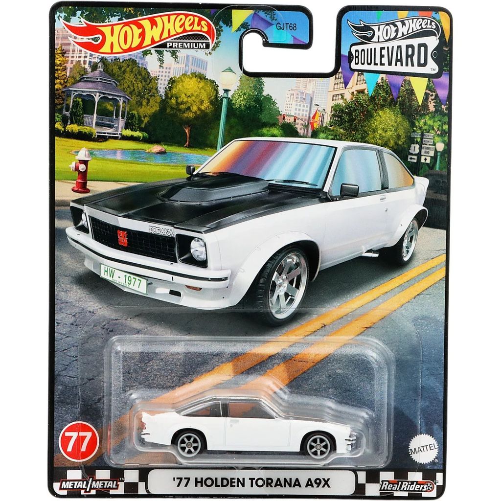 '77 Holden Torana A9X i hvid (med sort motorhjelm) fra Hot Wheels-serien Boulevard (mix 3 fra 2023), hvor denne Holden Torana er bil nummer 77.
