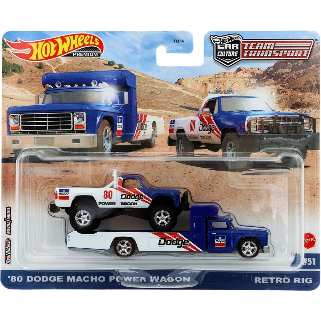 Fra Hot Wheels sælger vi denne Hot Wheels Premium 2023, Car Culture, Team Transport #51. Transporten består af en ’80 Dodge Macho Power Wagon, der transporteres på en Retro Rig.