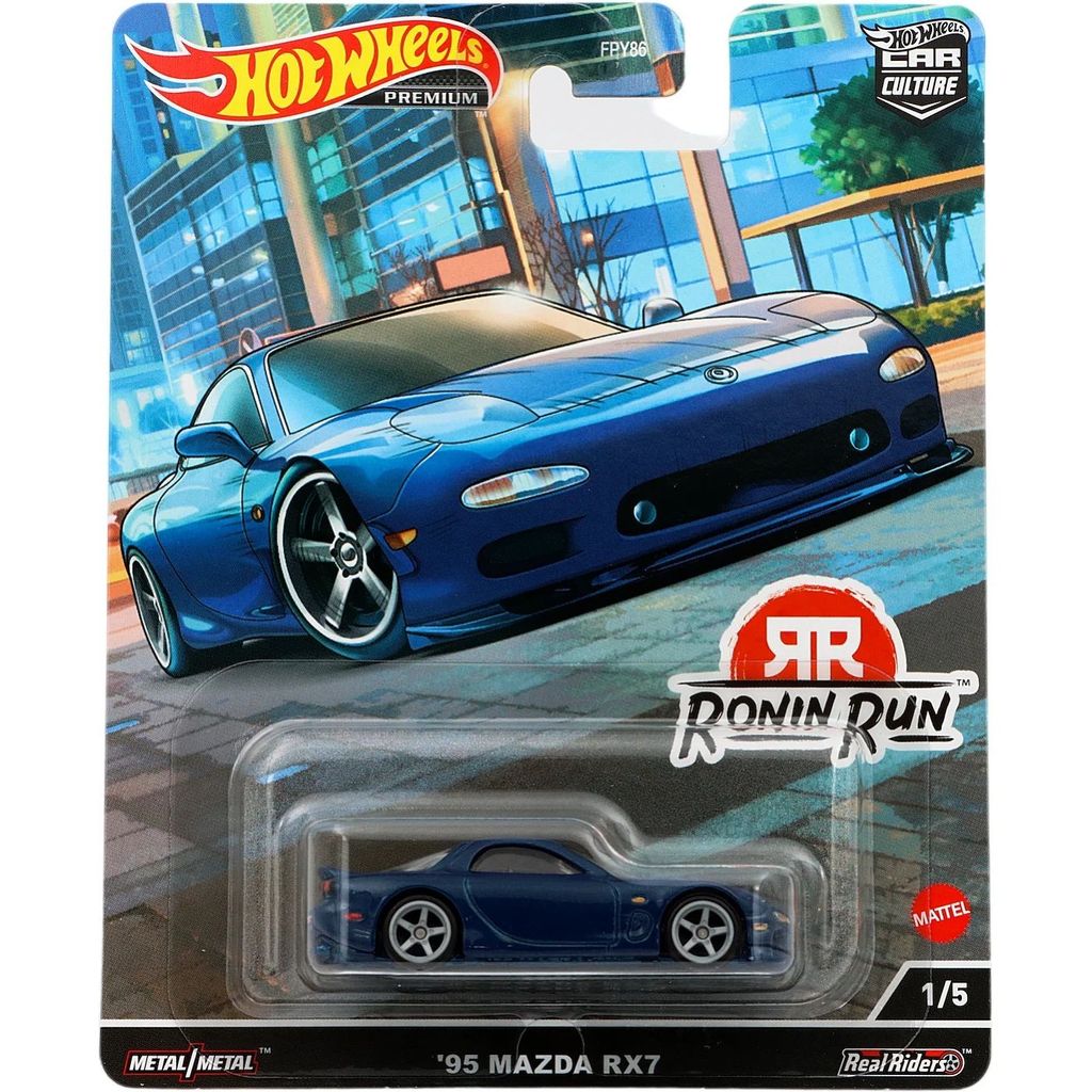 Blå '95 Mazda RX-7 fra Hot Wheels. Bilen er en del af Car Culture: Ronin Run-sættet fra 2022, hvor denne Mazda er bil nummer 1 ud af 5.