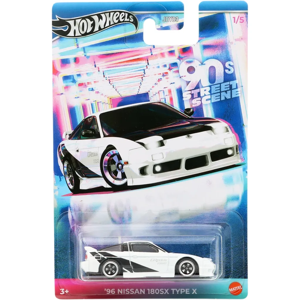 96 Nissan 180SX Type X i hvid og sort fra Hot Wheels og 90'ernes Street Scene-serie, hvor denne bil er nummer 1 ud af 5.